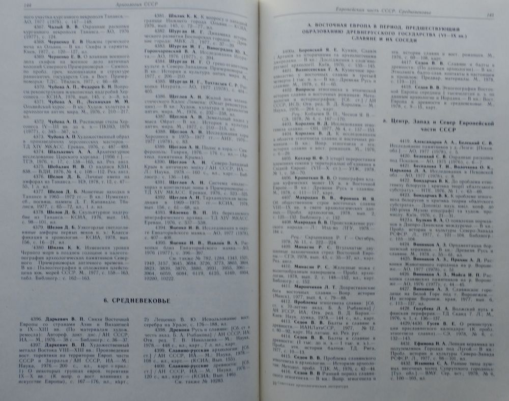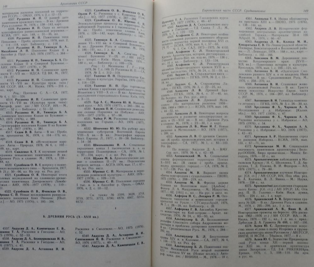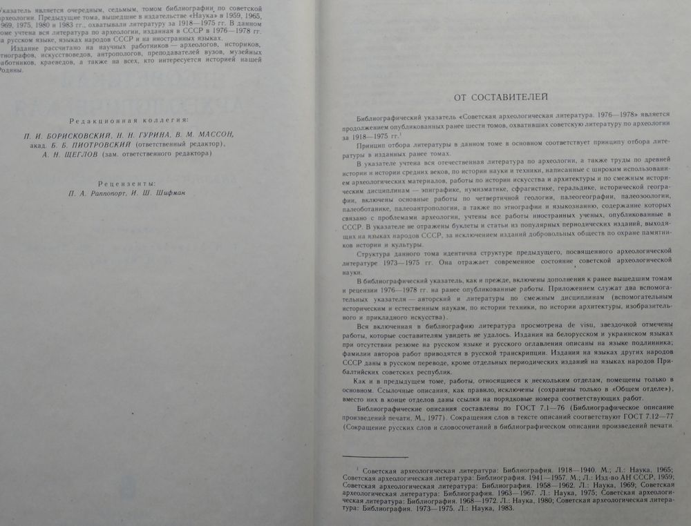 Большой энциклопедический формат. Тираж 1750 экз. 384 стр. В библиографическом указателе учтена вся отечественная литература по археологии, а также труды по древней истории и истории средних веков, по истории науки и техники, основанные на археологических материалах, работы по истории искусства и архитектуры и по смежным дисциплинам - эпиграфике, нумизматике, сфрагистике, геральдике, исторической географии. Включены основные работы по четвертичной геологии, палеогеографии, палеозоологии, палеоботанике" палеоантропологии, палеодемографии, а также по этнографии и языкознанию, содержание которых связано с проблемами археологии. В указателе учтены работы иностранных ученых, опубликованные в СССР. Не отражены буклеты и статьи из популярных периодичесжих изданий, выходящих на языках народов СССР, за исключением изданий добровольных обществ по охране памятников истории и культуры. Структура данного тома в основном идентична структуре предыдущих томов.