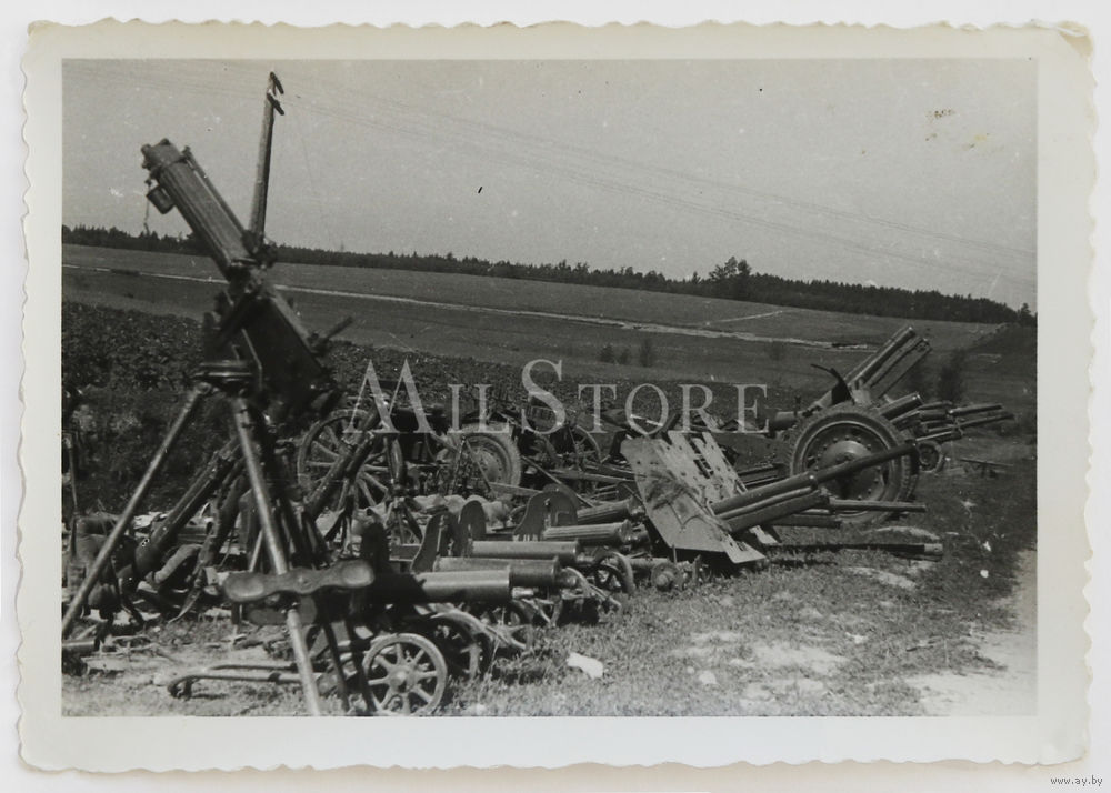 Советское оружие взятое в трофей немцами летом 1941 года. СССР. Операция "Барбаросса".На фотографии видны различные образцы советского оружия: станковые пулеметы, минометы, артиллерийские орудия (45-мм противотанковая пушка образца 1937 года, 76-мм полковая пушка образца 1927 года и др.). Отдельно на переднем плане обращает на себя внимание пулемет Максима с зенитным прицелом, установленный на универсальный станок Владимирова образца 1931 года, позволяющий вести огонь по воздушным целям. Размер около 7 см. х 10 см..