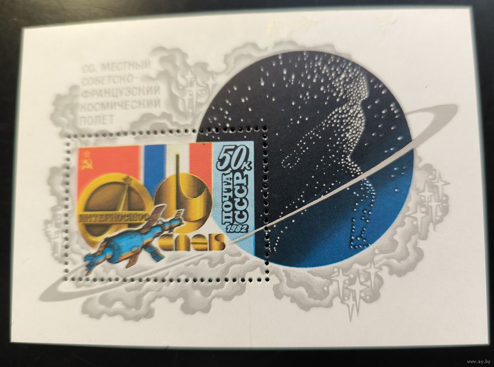 СССР. Совместный советско-французский космический полет на корабле "Союз-Т-6" (Заг № 5243, бл № 159). Не пропечатана буква "В" в слове "СОВМЕСТНЫЙ".
