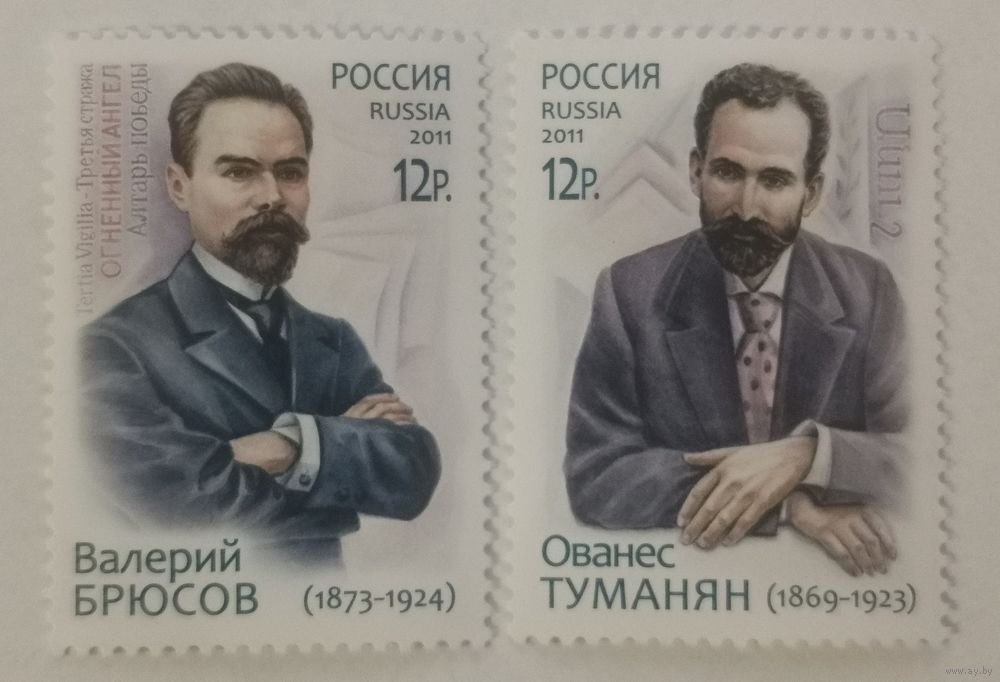 Совместный выпуск марок посвящён выдающимся представителям национальных культур России и Армении — В.Я. Брюсову и О.Т. Туманяну.