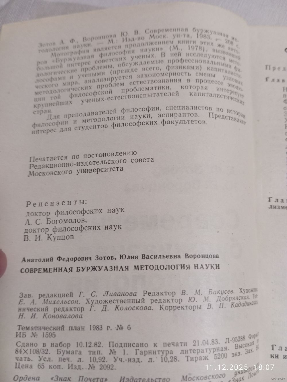 Современная буржуазная методология науки. Зотов А., Воронцова Ю. Редкая. МГУ 1983. В хорошем состоянии, мягкая обложка. 208 с. Тираж 5200. Возможность отправки Белпочтой, полная предоплата