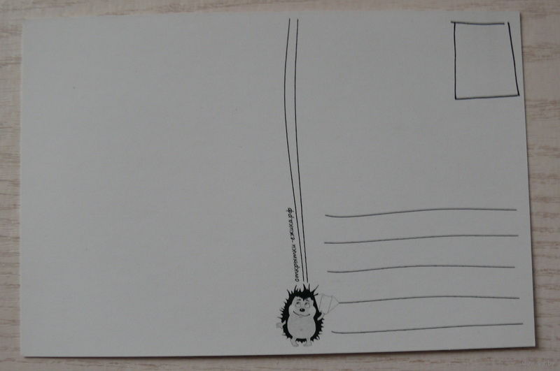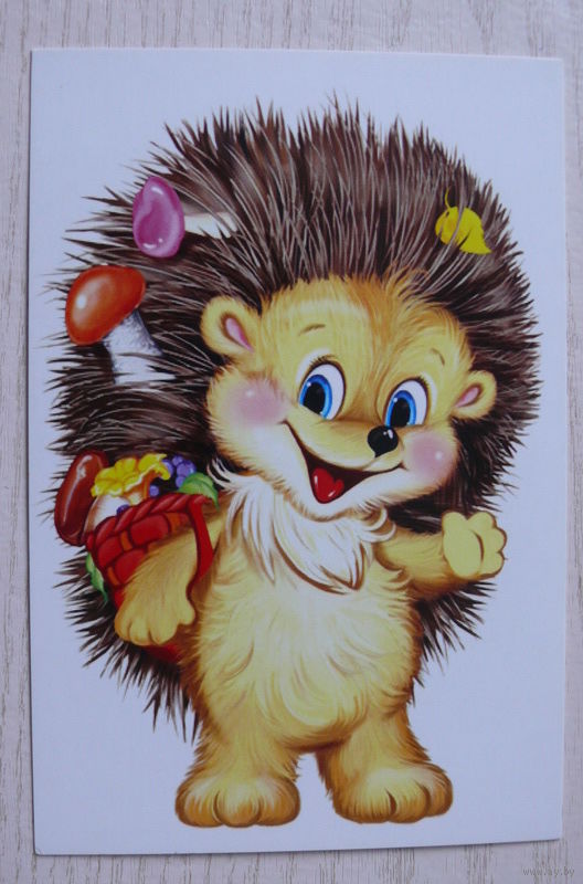 Современная открытка; Весёлый ёжик с грибами; чистая.