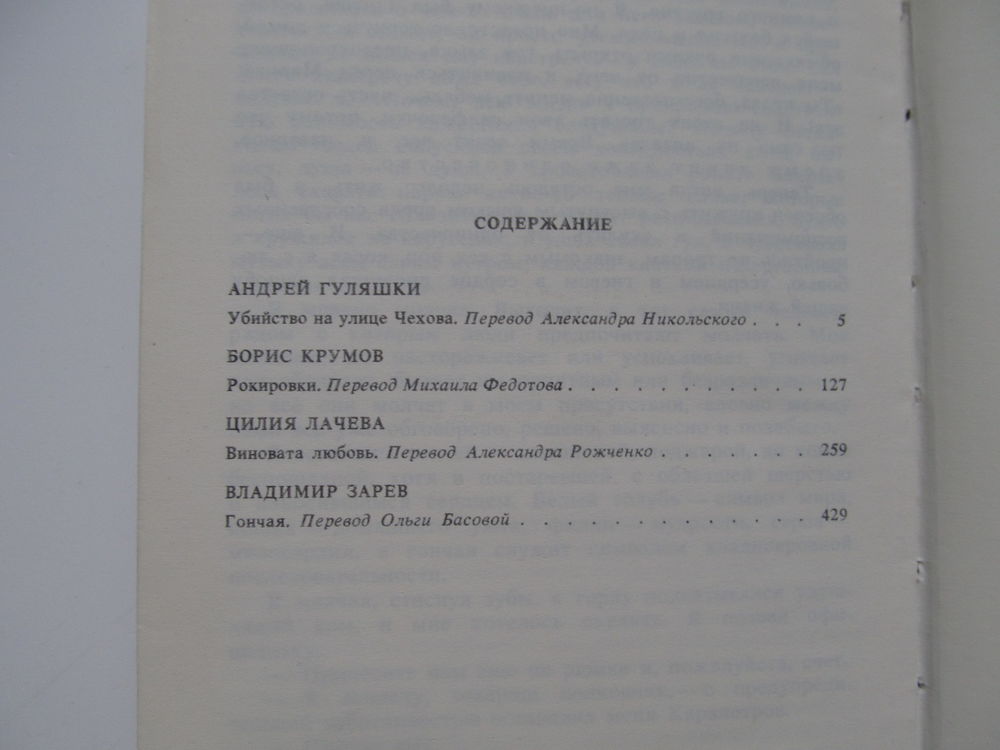 Сборник составляют детективные романы. В романе А. Гуляшки "Убийство на улице Чехова" расследуется убийство ученого-бактериолога. Проблемам воспитания, борьбе против негативных явлений в среде современной городской молодежи посвящен роман Б. Крумова "Рокировки". Ц. Лачева представлена социально-психологическим детективом "Виновата любовь", действие которого разворачивается на большой стройке. В. Зарев в романе "Гончая" предлагает образ современного следователя - тонкого психолога, гражданина, стоящего на страже закона.