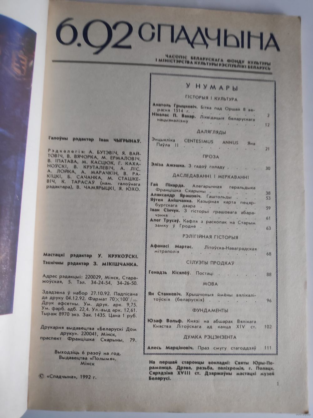 Часопіс «Спадчына» ўтварыўся у 1989 г. на базе бюлетэня «Помнікі гісторыі і культуры Беларусі». На хвалі нацыянальнага адраджэння часопіс гуртаваў неабыякавых да беларускай гісторыі і культуры навукоўцаў, публіцыстаў, літаратараў. Выданне прапагандавала гісторыка-культурную спадчыну беларусаў, змяшчала пераклады і перадрукі гістарычных крыніц, твораў айчынных і замежных гісторыкаў, пісьменнікаў, паэтаў. Дзякуючы «Спадчыне», для шырокай грамадскасці былі адкрытыя забытыя раней імёны. У № 6 часопіса «Спадчына» за 1992 г. змешчаны артыкулы Анатоля Грыцкевіча аб бітве пад Оршай 8 верасня 1514 г., Аляксандра Ярашэвіча аб Гаштольдах, Алега Трусава пра кафлю з раскопак Старога замка ў Гродне, Івана Сінчука па гісторыі грашовага абарачэння, Яна Станкевіча аб хрышчоных імёнах вялікіх літоўскіх князёў, урыўкі з прац Афанасія Мартаса аб Літоўска-Наваградскай мітраполіі, Юзафа Вольфа аб князях у ВКЛ ад канца XIV ст. і Гая Пікарда аб алегарычнай геральдыцы Францыска Скарыны, а таксама іншыя матэрыялы.
