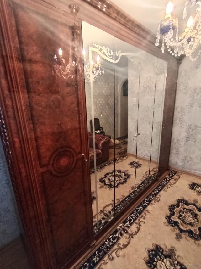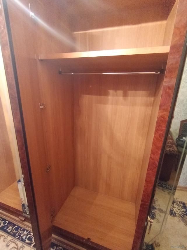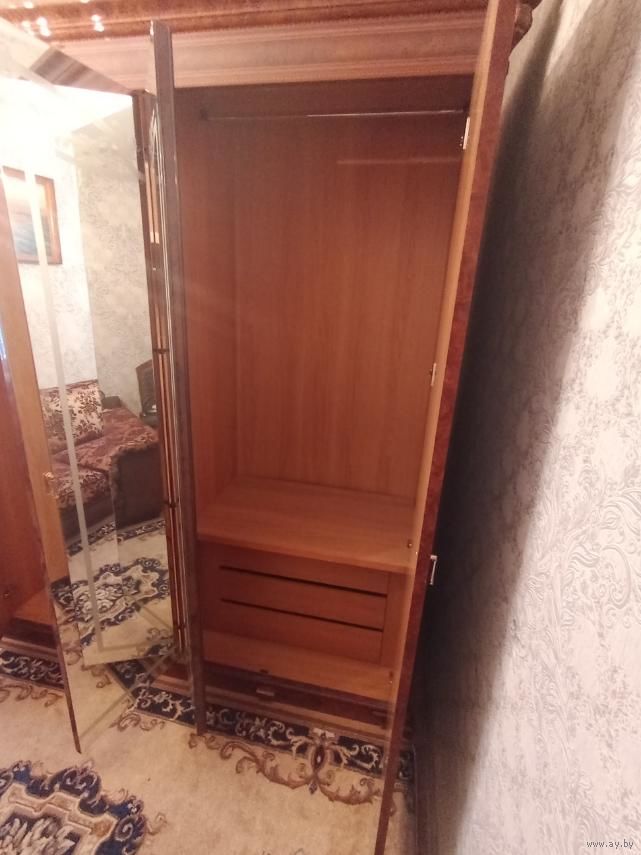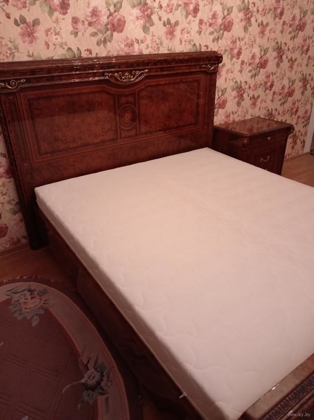 Шкаф: длина 3 м 20 см., высота 2м 30 см , глубина 60 см. Туалетный столик: длина 1м 87см, высота 78см, глубина 43см. Две прикроватные тумбочки: длина 65см, глубина 43см 43см. Кровать с матрасом: 160смХ200см, высота в головной части 123см. Зеркало: длина 146см, высота 110см. Фасад шпон Самовывоз.