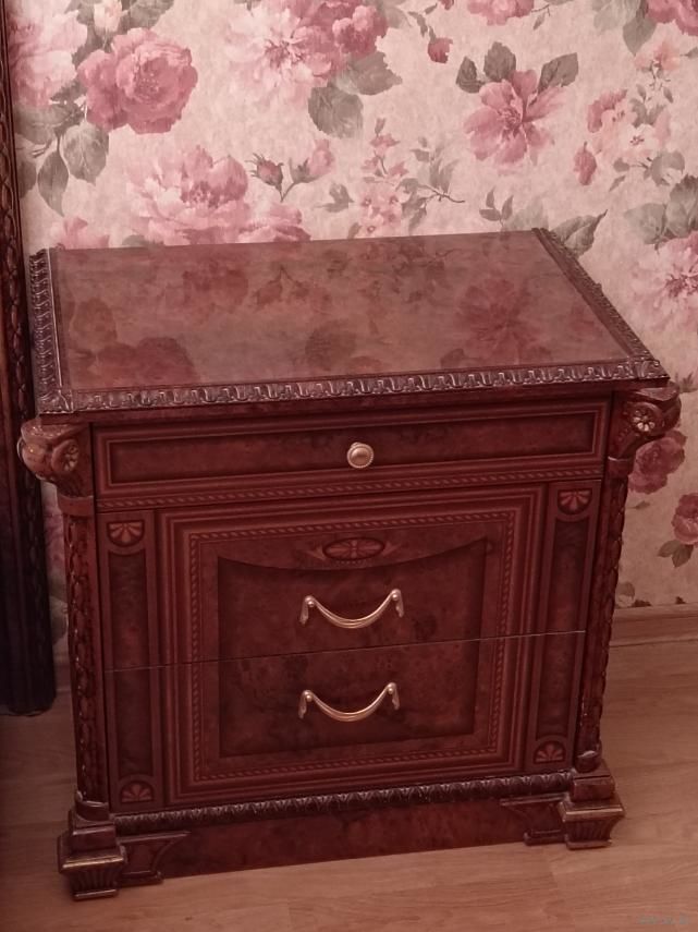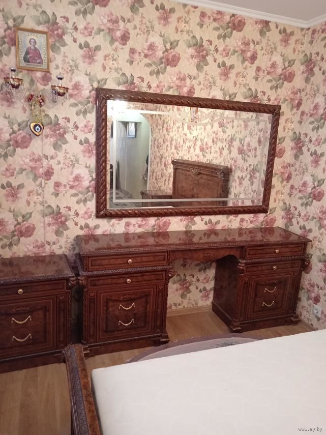 Туалетный столик: длина 1м 87см, высота 78см, глубина 43см. Две прикроватные тумбочки: длина 65см, глубина 43см 43см. Кровать с матрасом: 160смХ200см, высота в головной части 123см. Зеркало: длина 146см, высота 110см