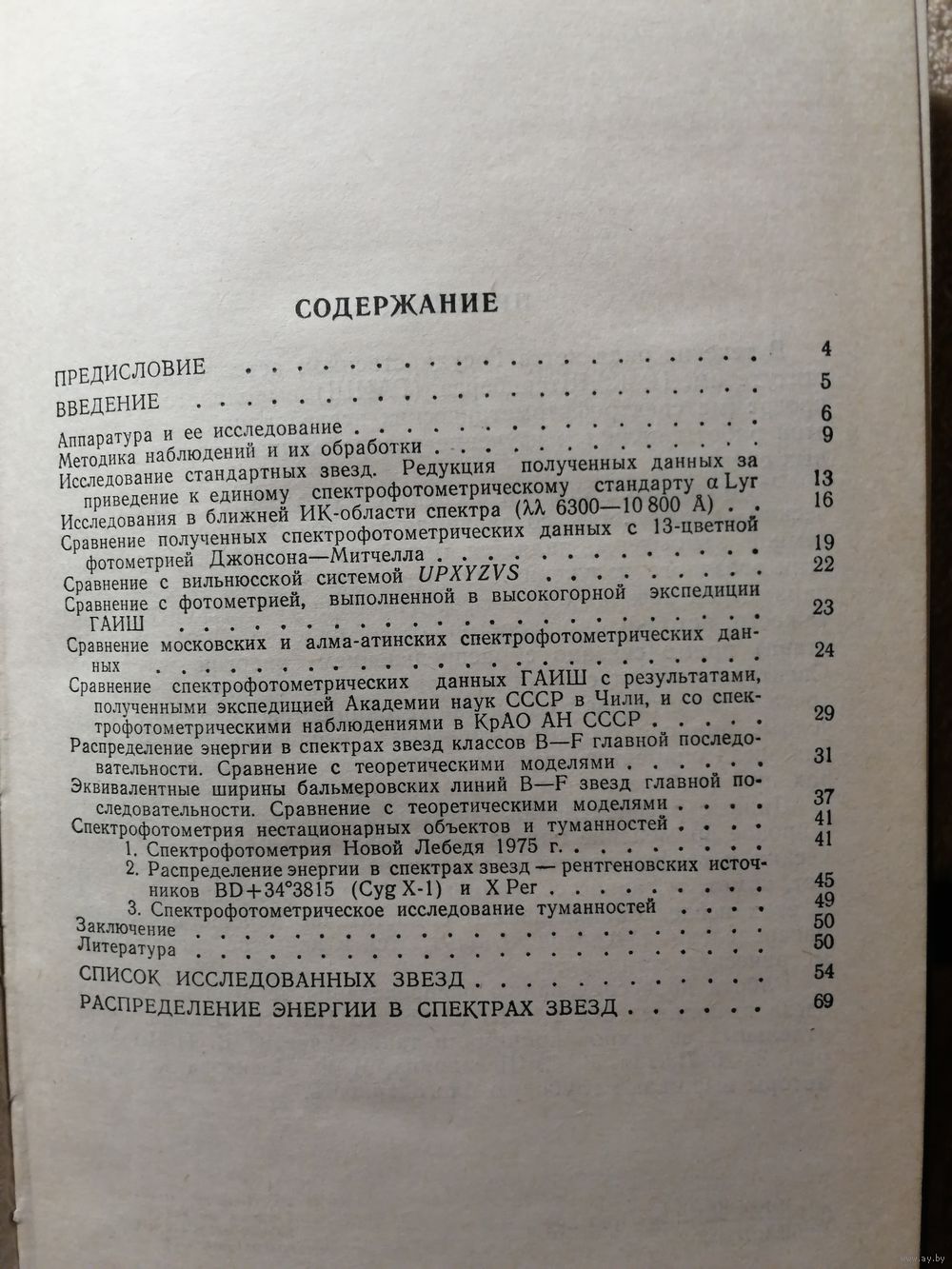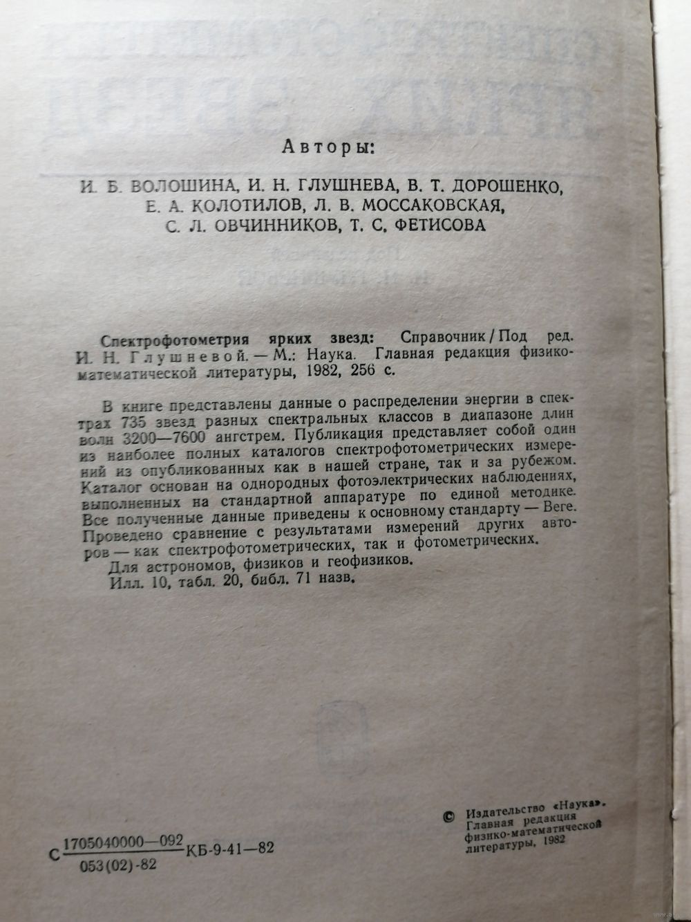 В книге представлены данные о распределении энергии в спектра 735 звёзд разных спектральных классов в диапазоне волн 3200-7600 А. Публикация представляет собой один из наиболее полных каталогов спектрофотометрических измерений. Каталог основан на однородных фотоэлектрических наблюдения, выполненных на стандартной аппаратуре по стандартной методике. Всё данные приведены к Веге.