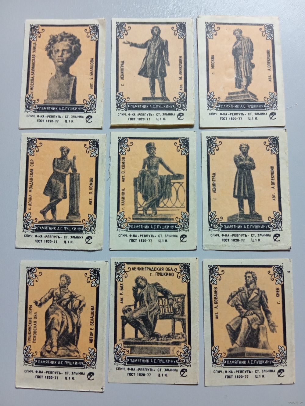 Спичечные этикетки ф.Ревпуть. Памятники А.С.Пушкину