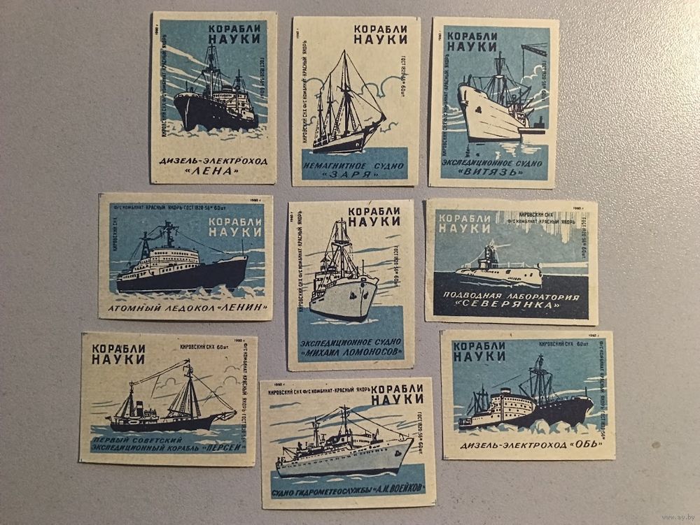 Спичечные этикетки Комбинат "Красный Якорь" (ф-ка "Белка").Корабли науки. ГОСТ 1820-56. 1959 год