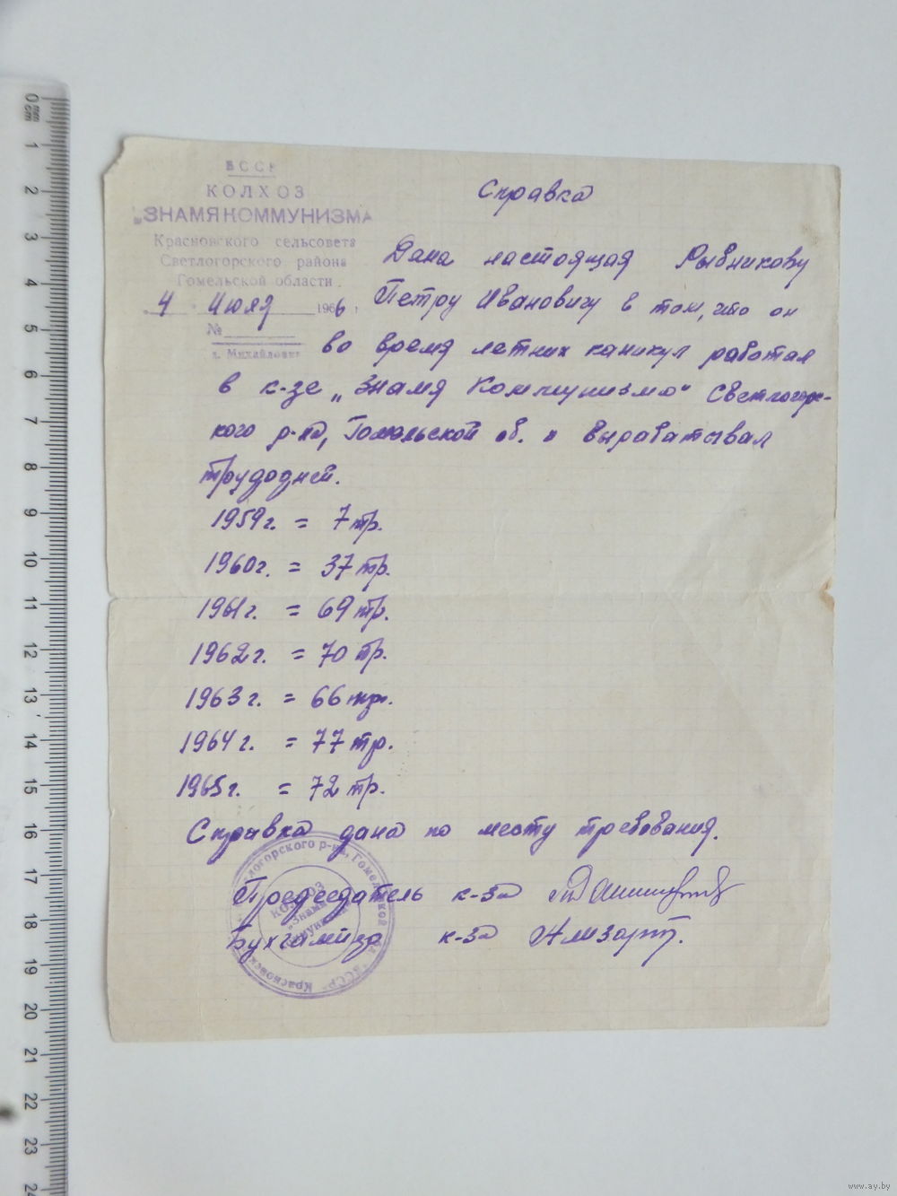 Справка колхоз Знамя коммунизма БССР 1966 г