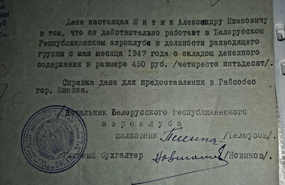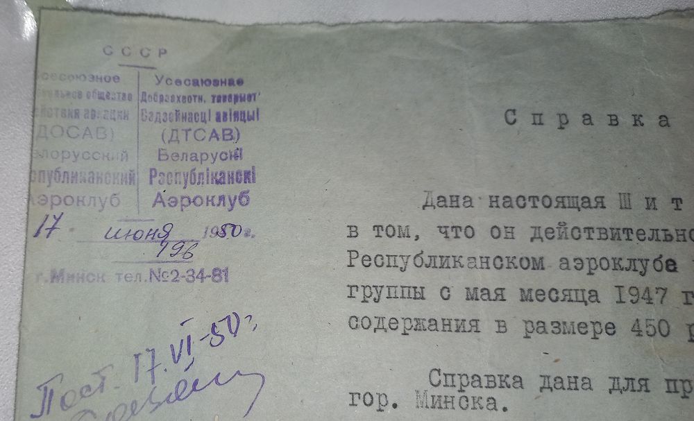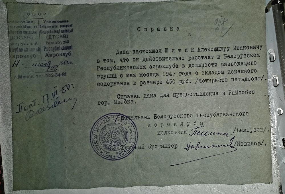 справка Минский авиаклуб 1950г (алб)