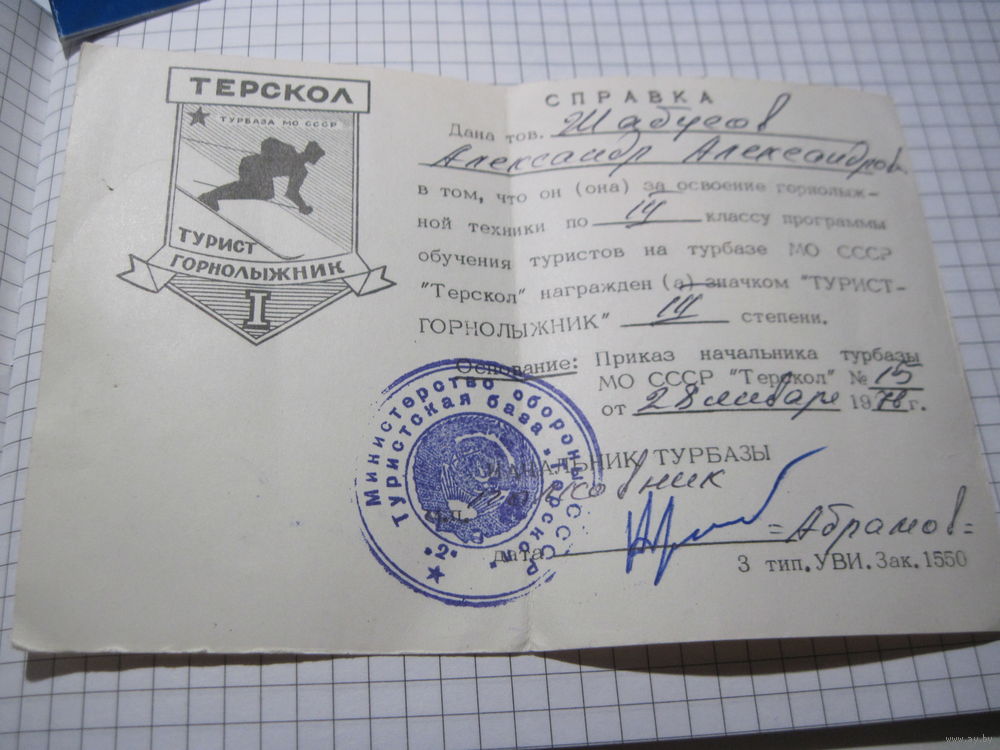 Справка о награждении знаком "Турист-горнолыжник 3 степени" 1978 г с рубля!