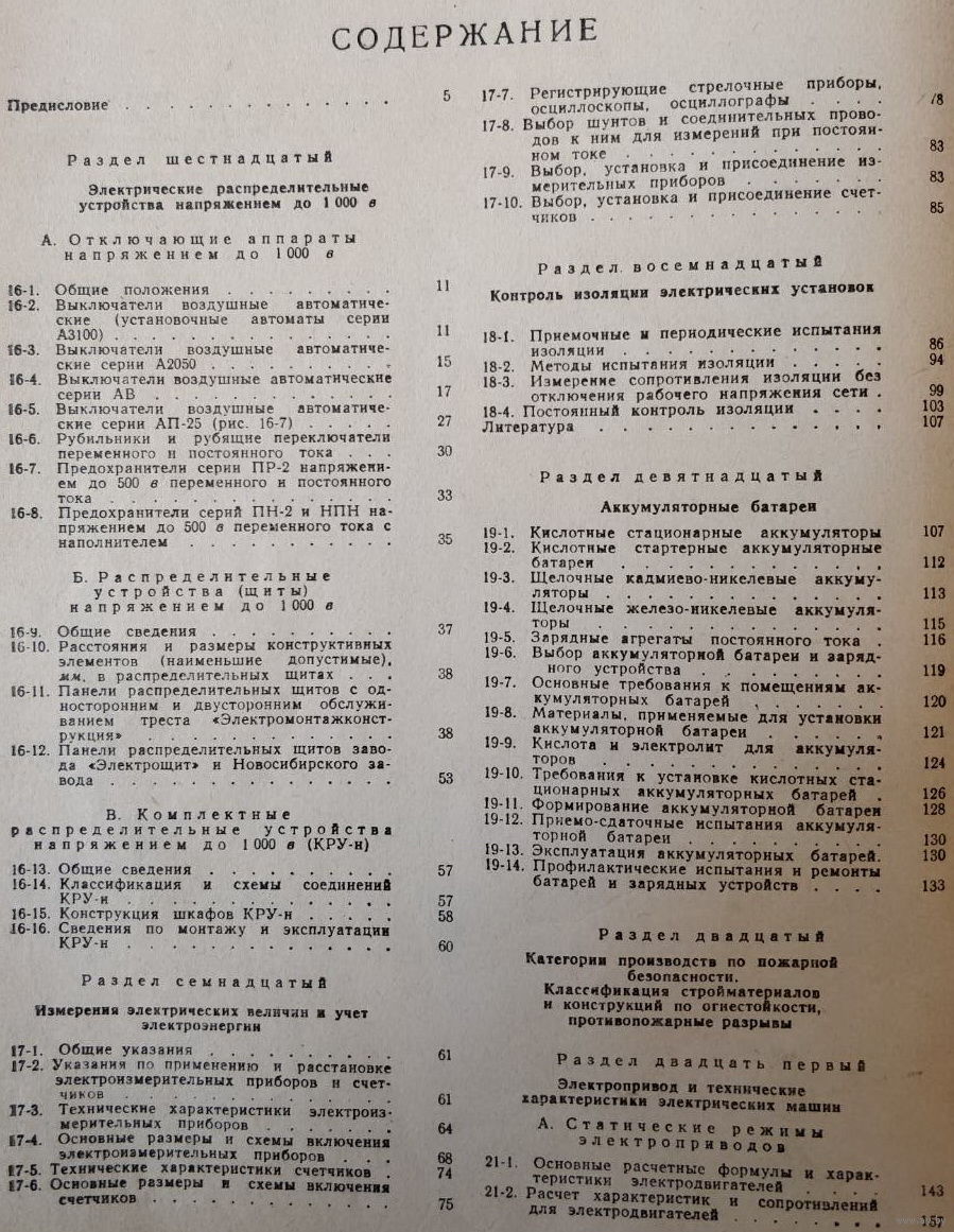 В разделах 16-20 – сведения по аппаратуре и распределительным устройствам напряжением ниже 1000 В, измерительным приборам, устройствам контроля изоляции и краткие сведения о допустимых разрывах между зданиями по пожарным нормам.