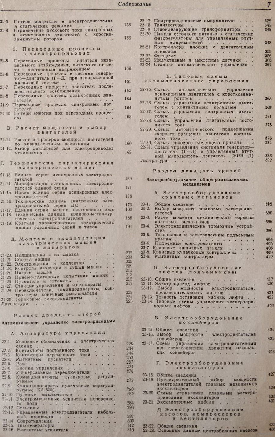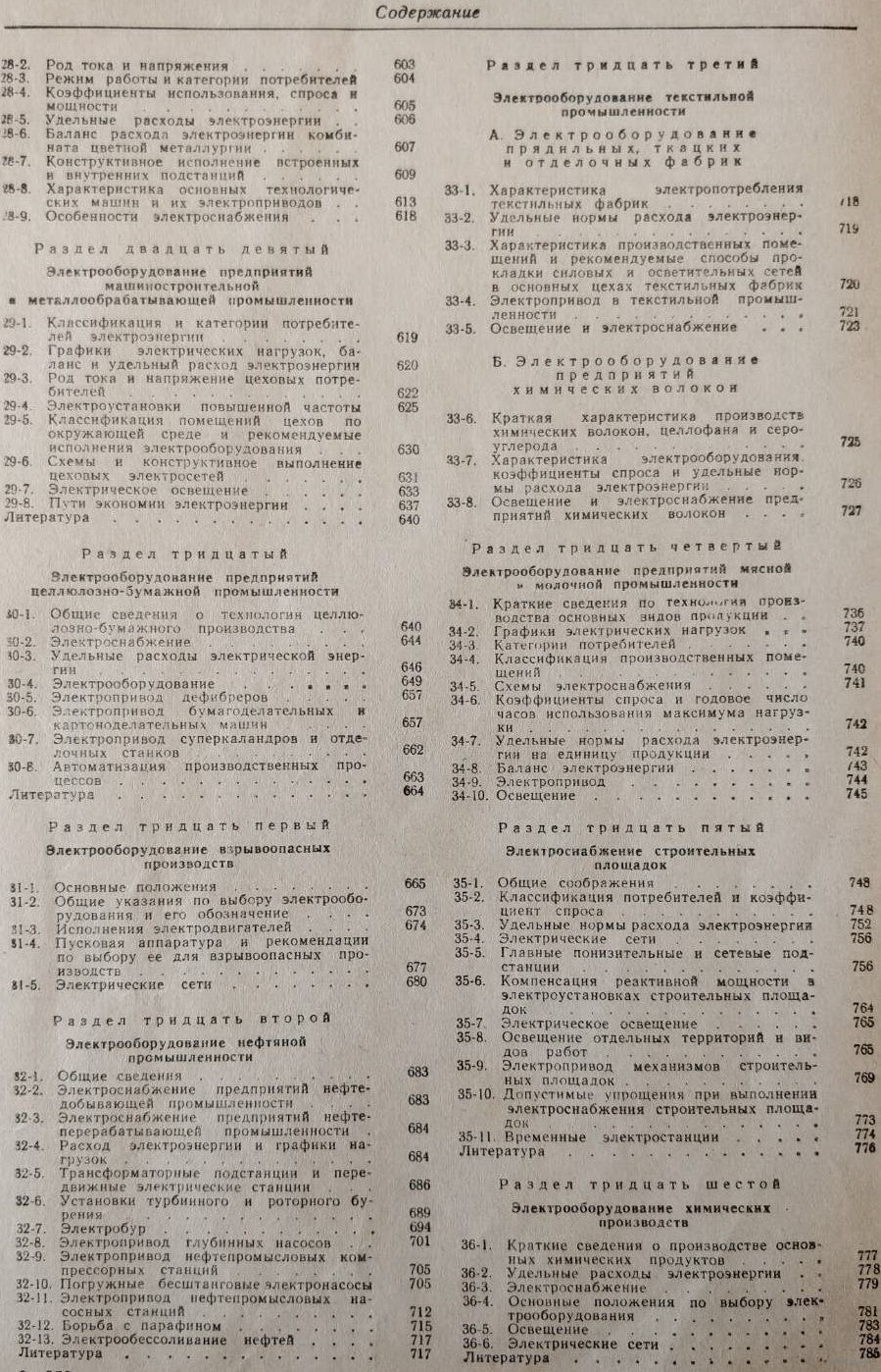 В разделах 27-37 – сведения по электрооборудованию чёрной и цветной металлургии, машиностроению, химической, нефтедобывающей, бумажной, пищевой, текстильной, строительной и угольной отраслям промышленности.