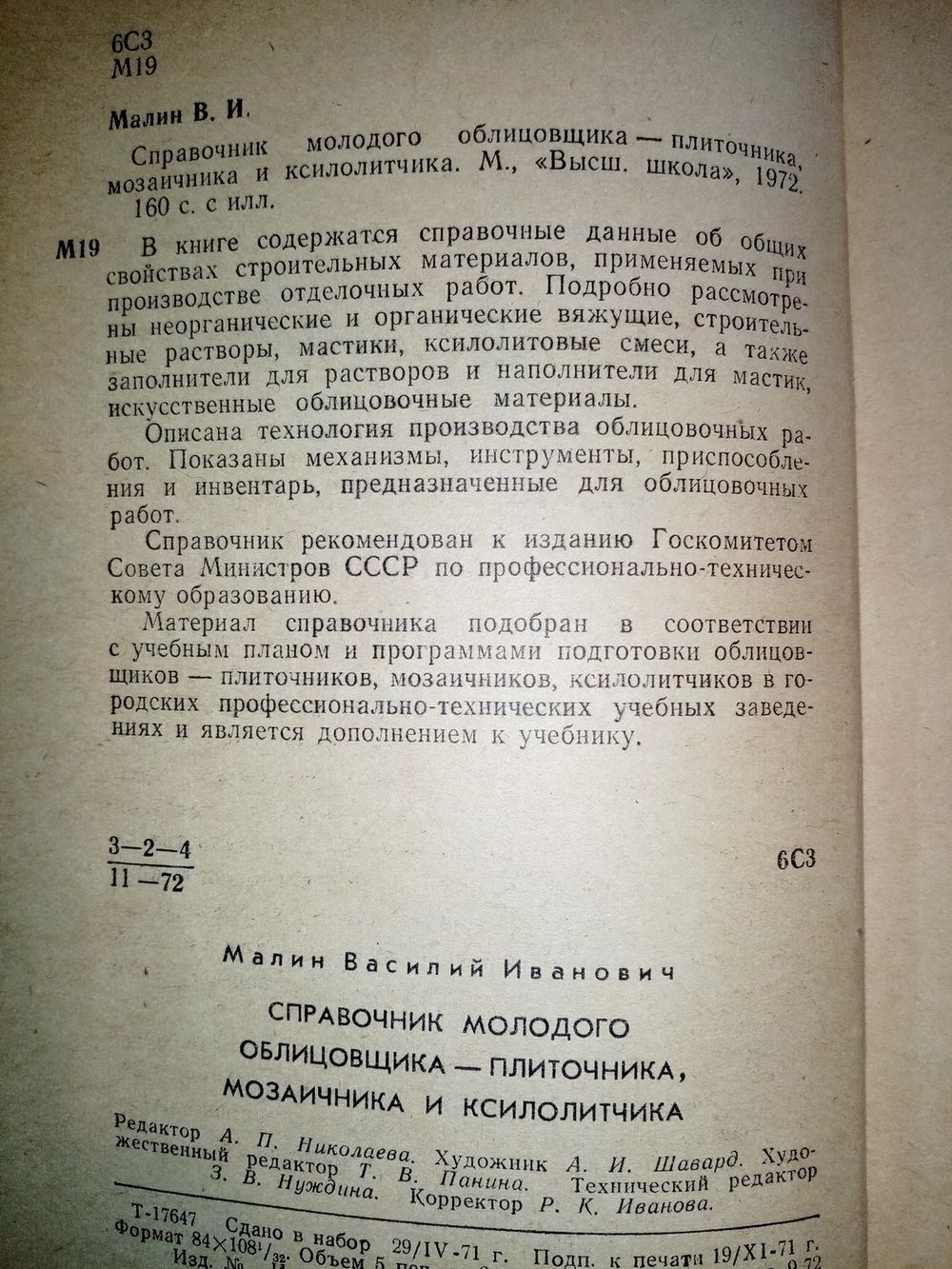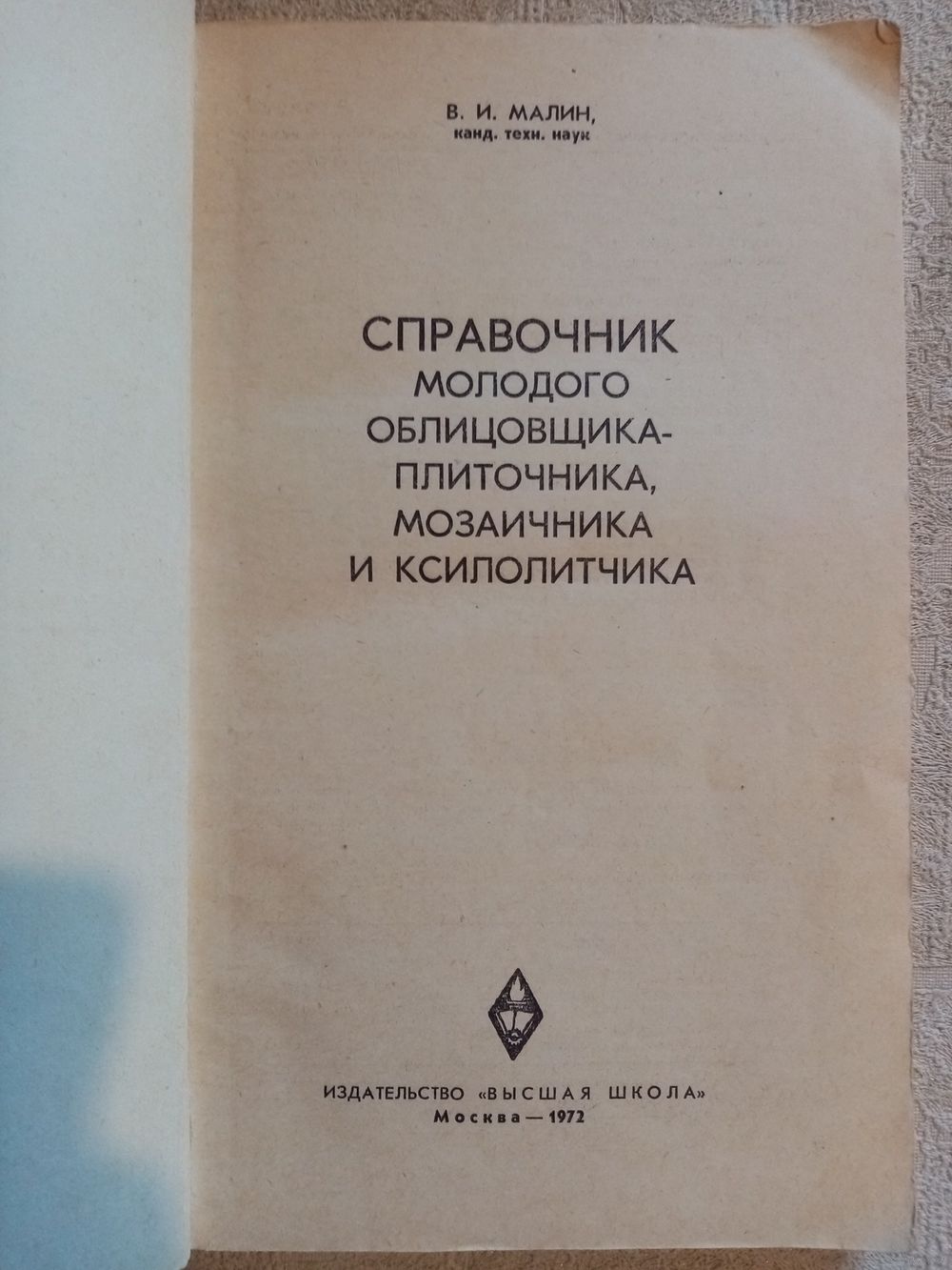 Справочник молодого облицовщика-плиточника, мозаичника и ксилолитчика. 1972 г В.И. Малин