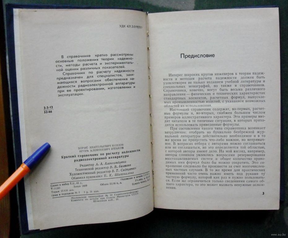 В справочнике рассматриваются вопросы расчета надежности на различных этапах разработки и эксплуатации, определения оптимальных режимов эксплуатации и устранения неисправностей, нахождения оптимального числа запасных или резервных элементов при наличии экономических ограничений, а также производится оценка надежности по результатам испытаний и эксплуатации. Весь материал представлен в виде таблиц, удобных для практического использования. Приводится аннотированная библиография книг по проблеме надежности, вышедших на русском языке. Справочник будет полезен инженерам и математикам-прикладникам, занятым созданием современных сложных систем и обеспечением надежности их функционирования, а также преподавателям и студентам вузов.