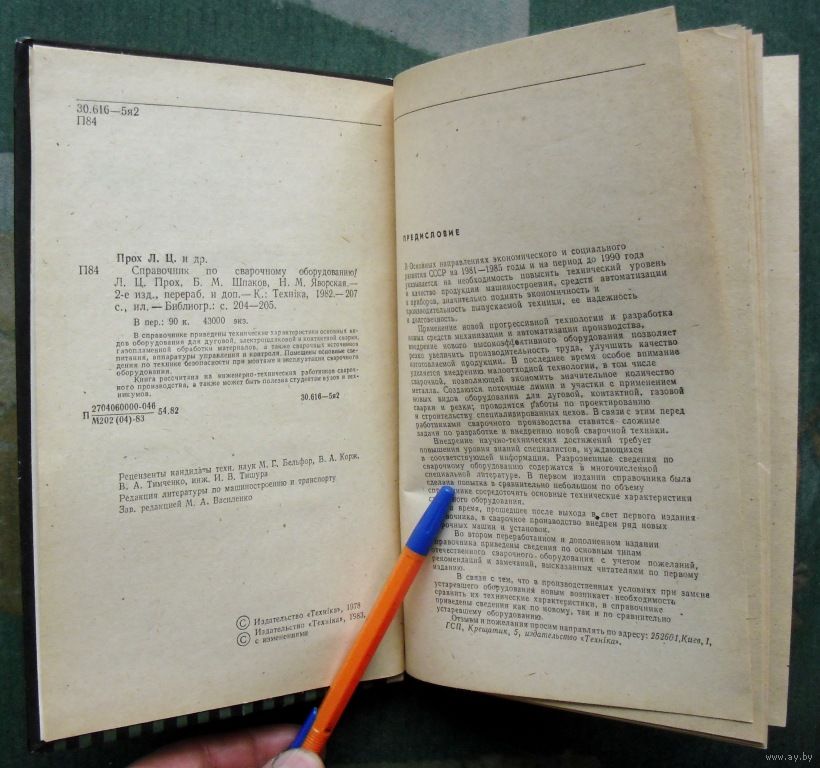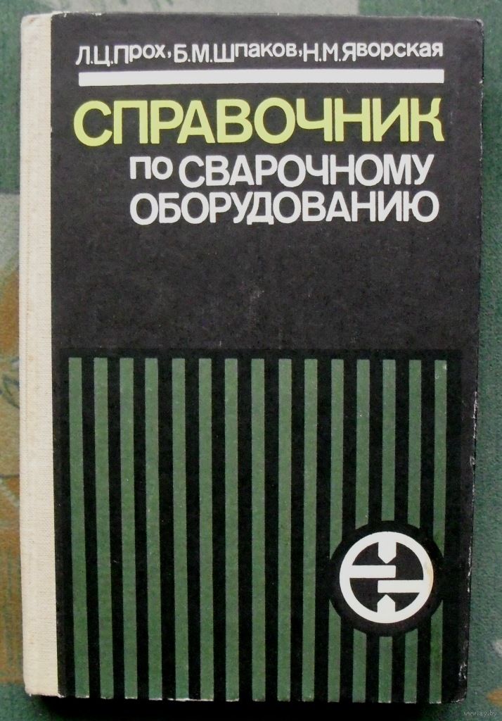 «Справочник по сварочному оборудованию» авторов Л. Ц. Прох, Б. М. Шпаков, Н. М. Яворская (2-е изд., перераб. и доп., Киев: «Технiка», 1983) В справочнике приведены технические характеристики основных видов оборудования для дуговой, электрошлаковой и контактной сварки, газопламенной обработки материалов, а также сварочных источников питания, аппаратуры управления и контроля. Помещены основные сведения по технике безопасности при монтаже и эксплуатации сварочного оборудования.