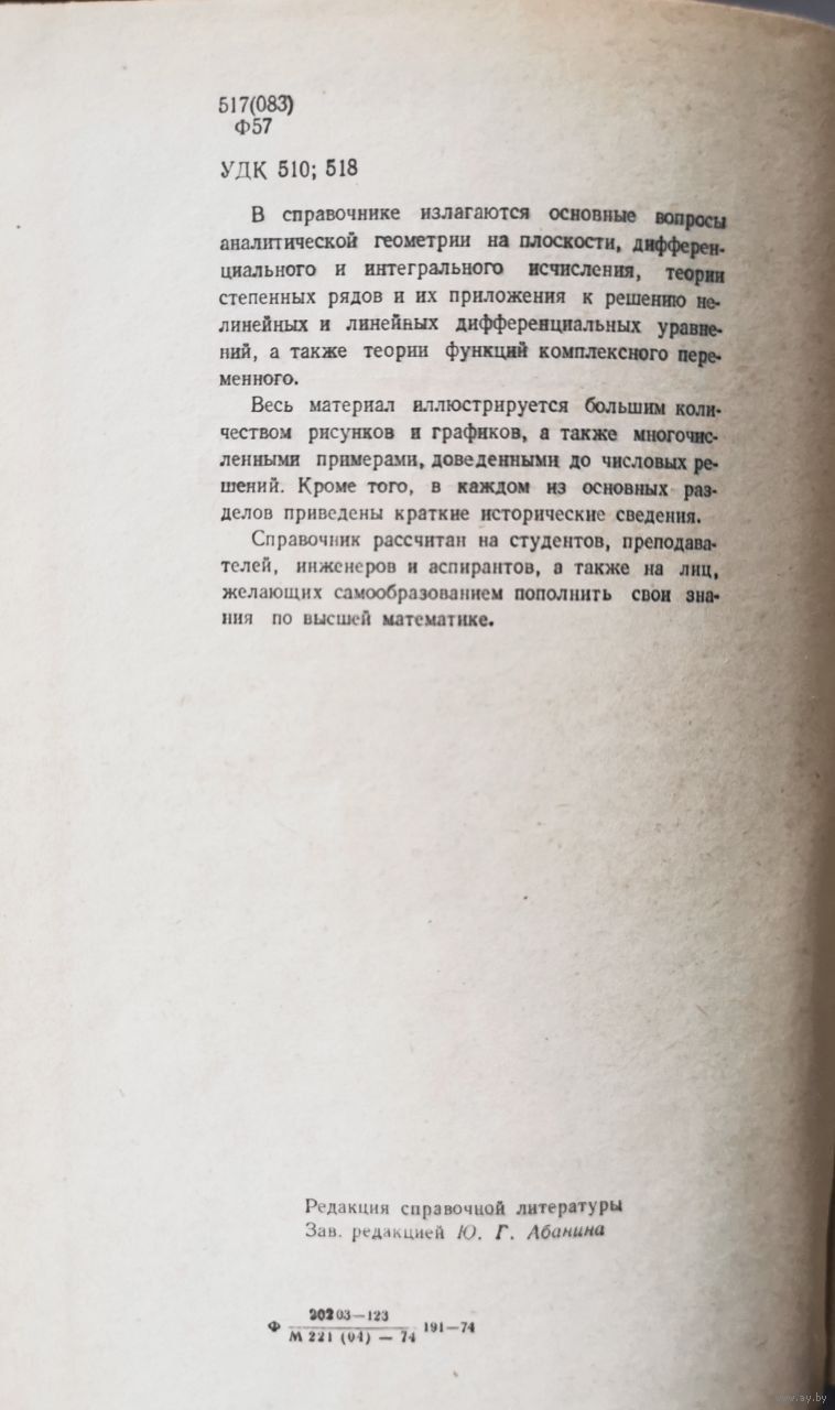 Изложены основные вопросы аналитической геометрии на плоскости, дифференциального и интегрального исчисления, теории степенных рядов и их приложения к решению нелинейных и линейных дифференциальных уравнений... Состояние справочника хорошее.
