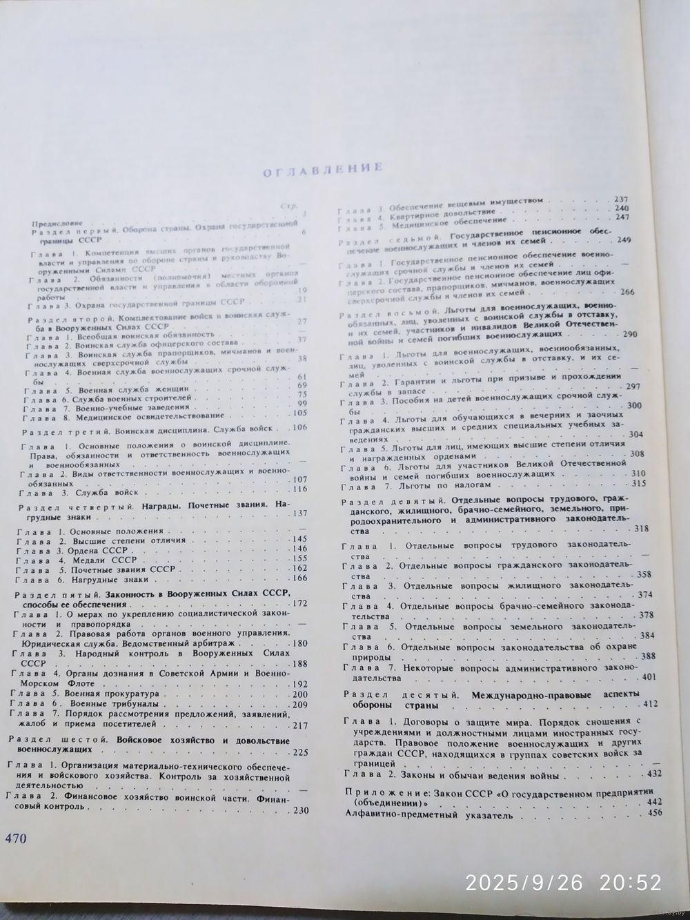 В Справочнике содержатся законы СССР, указы и постановления Президиума Верховного Совета СССР, постановления и распоряжения Совета Министров СССР, приказы и директивы Министра обороны СССР, инструкции, положения, наставления и другие ведомственные акты. В некоторых случаях приводятся также законы РСФСР, указы Президиума Верховного Совета РСФСР, постановления и распоряжения Совета Министров РСФСР. При ознакомлении с ними следует иметь в виду, что в других союзных республиках действуют аналогичные нормативные акты. В Справочник включены и некоторые международно-правовые документы, отражающие деятельность Советского государства по вопросам защиты мира и социализма, сотрудничества и взаимной помощи с другими социалистическими государствами.