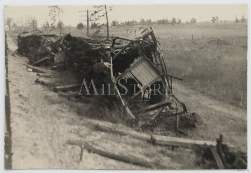 Уничтоженные вагоны, спущенного под откос немецкого поезда на участке между БССР и РСФСР, в тылу группы армий "Центр". Фото одного из подразделений 45-й пехотной дивизии. 45-я пехотная дивизия летом 1941 года штурмовала Брестскую крепость, а позже участвовала в наступлении на Москву, где понесла тяжелые потери. Достаточно редкий сюжет фотографии - видны последствия действий партизан и партизанской войны. Смотрите другие фотографии этой серии. Размер около 5,4 см. х 7,8 см..