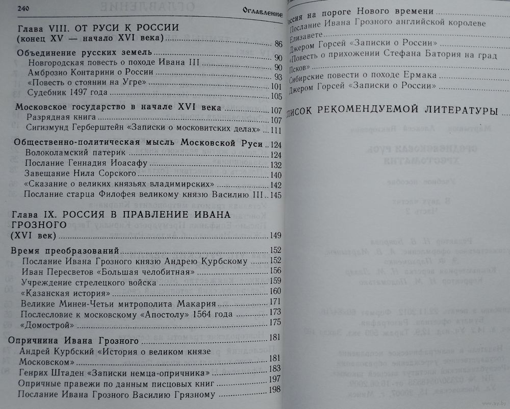 Цена за 2 тома. Большой формат. Тираж 500 экз. 288+242 стр. В книге представлены материалы по истории России с древнейших времен до конца XVI века, отражающие основные этапы русской истории, тенденции социально-экономического развития, вопросы культуры, ментальности и повседневной жизни Средневековой Руси, место русских земель в тогдашнем мире и связи с другими странами и народами. Наряду с известными материалами по истории восточных славян в ней представлены источники, ранее не включавшиеся в учебные пособия.