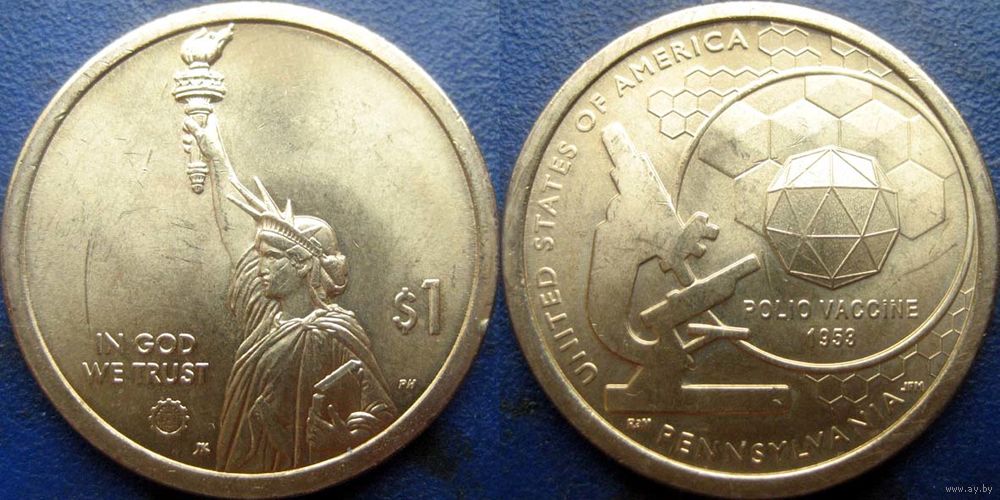 США. 1 доллар 2019. N3 Американские инновации. Вакцина против полиомиелита. Пенсильвания. Минтмарка P.