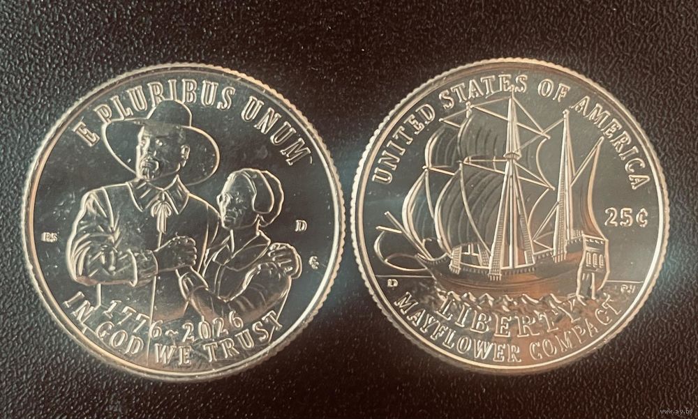 США 25 центов 2026 250 лет Независимости 175 лет Мэйфлауэрского договора двор D UNC