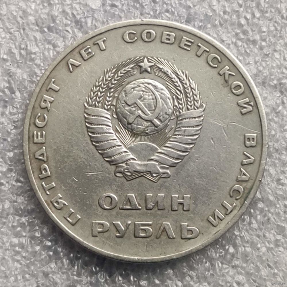 Номер Y # 140 Страна СССР Период Советский Союз (1961 - 1991) Валюта Советский рубль Вид чекана Юбилейные монеты Номинал 1 рубль Год 1967 Наименование 50 лет Советской власти Гурт Надпись Описание гурта '1917-1967 ⋆ СЛАВА ВЕЛИКОМУ ОКТЯБРЮ ⋆' Форма Круг Отношение авс/рев Медальное (0°) Материал Медь-Цинк-Никель Вес (g) 11,25 Диаметр (mm) 31 Толщина (mm) 2,1