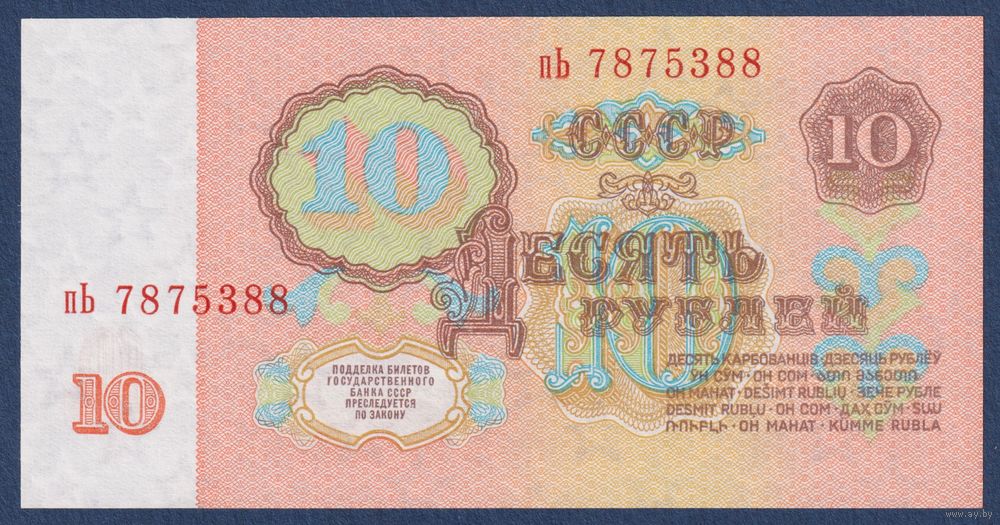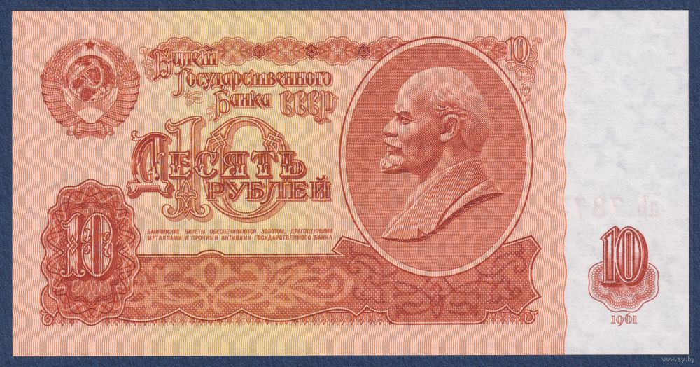 СССР, 10 рублей 1961 г, P-233a(3) (серия пЬ, 3-ий выпуск, с УФ печатью), UNC