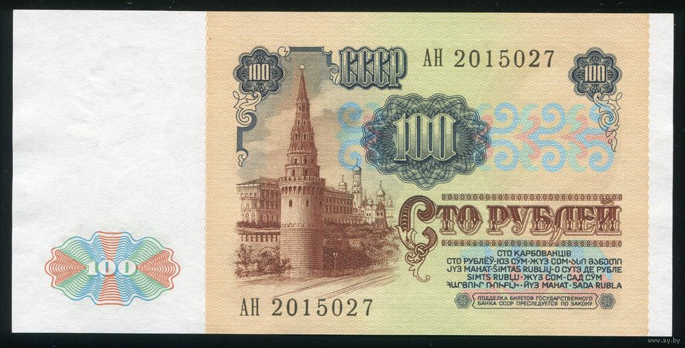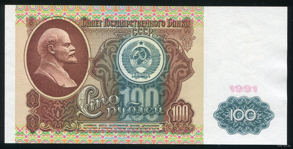СССР. 100 рублей образца 1991 года. I-й выпуск. Водяной знак - Ленин. Серия АН. UNC