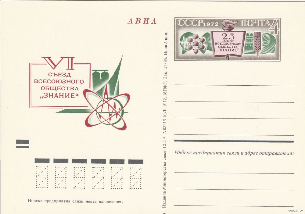 СССР 1972 ПК с ОМ 25-летие Всесоюзного общества Знание. VI съезд общества (к3)