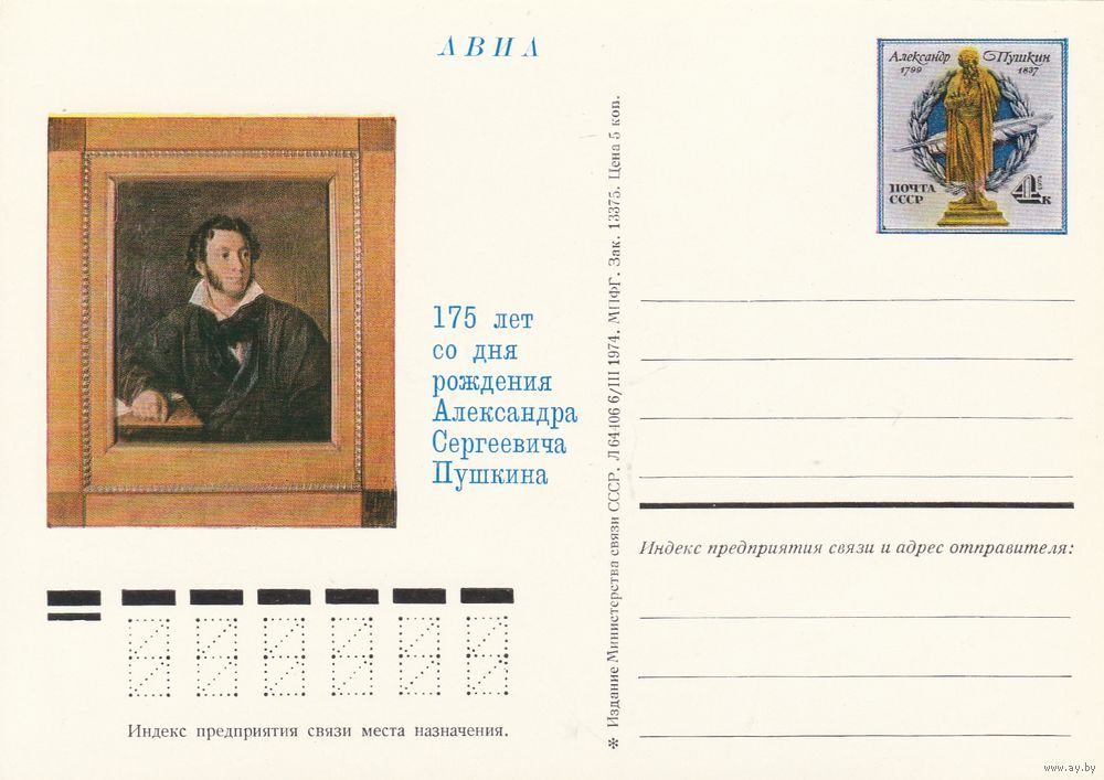 СССР 1974 ПК с ОМ 175-летие со дня рождения А. С. Пушкина (к3)