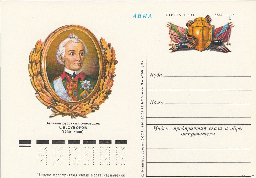 СССР 1980 ПК с ОМ 250-летие со дня рождения А. В. Суворова (к3)