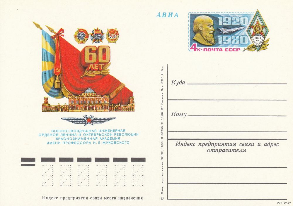 СССР 1980 ПК с ОМ 60-летие Военно-воздушной академии им. проф. Н. Е. Жуковского (к3)