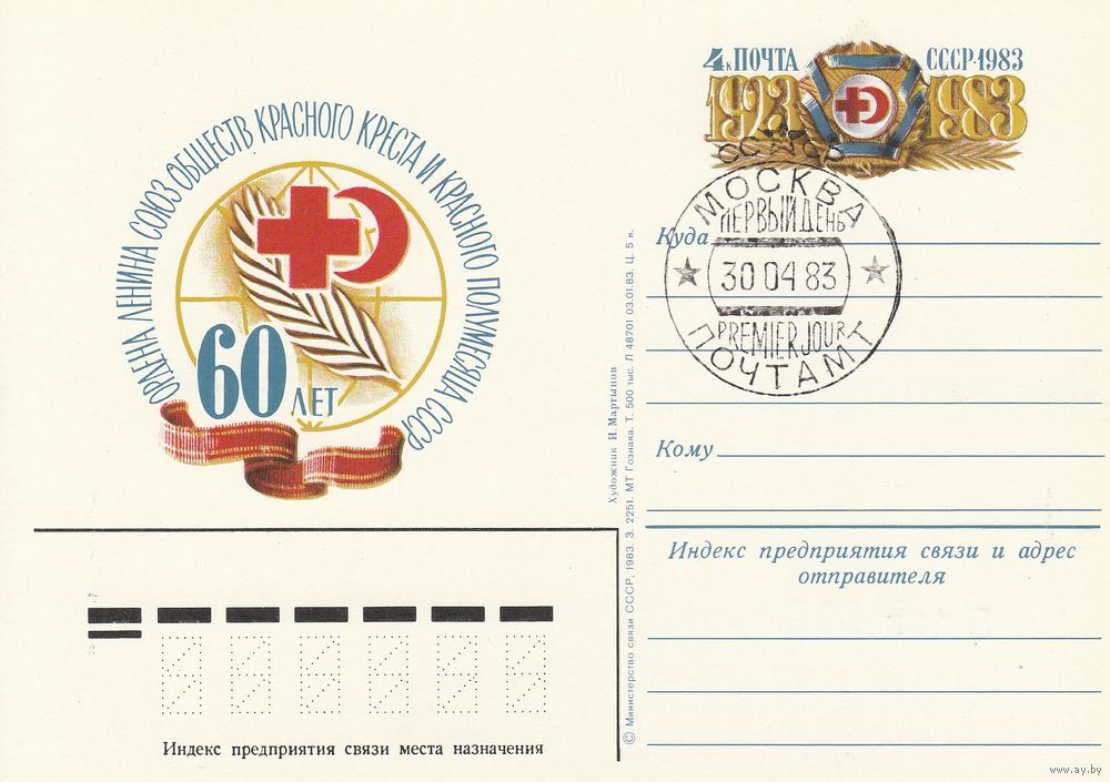 СССР 1983 ПК с ОМ со СГ 60-летие Союза обществ Красного Креста и Красного Полумесяца СССР (к3)