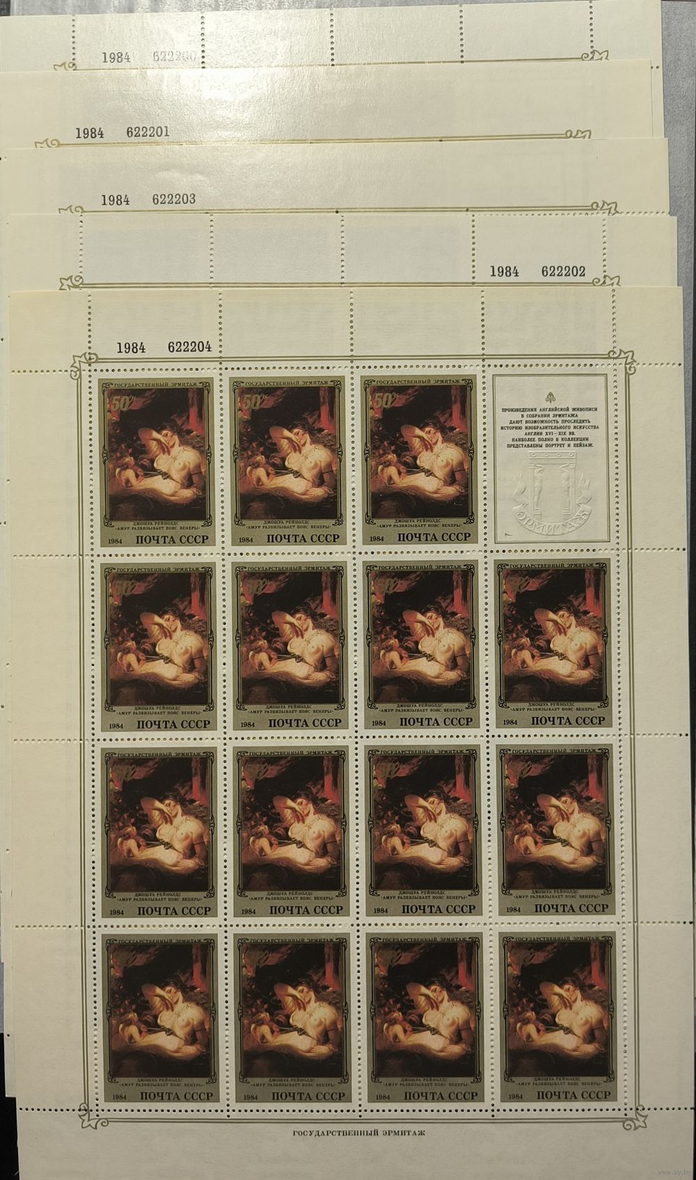 СССР. 1984. Эрмитаж (английская живопись). Листы с купонами (4х4). Полная серия (Соловьев № 5483-87).