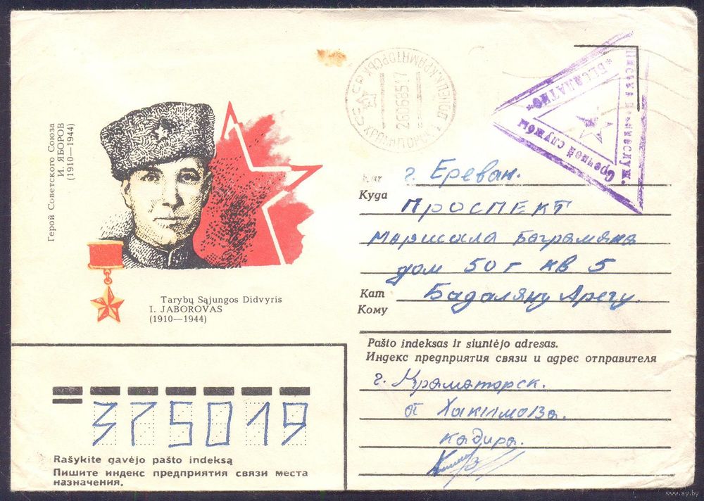 СССР 1984 конверт Герой СССР Яборов прошедший почту воинское
