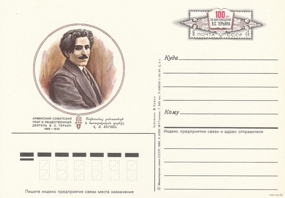 СССР 1985 ПК с ОМ 100-летие со дня рождения В. С. Терьяна, армянского поэта и общественного деятеля (к3)