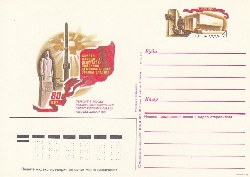 СССР 1985 ПК с ОМ 80-летие Иваново-Вознесенского общегородского Совета рабочих депутатов - прообраза органов советской власти (к3)