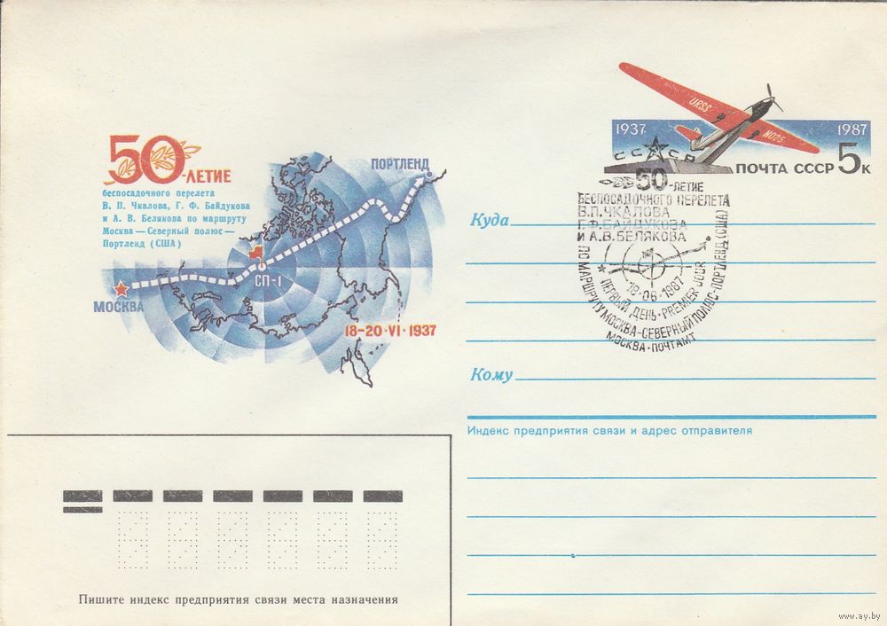 СССР 1987 МХК с ОМ со СГ 50-летие беспосадочного перелета Чкалова (к2)