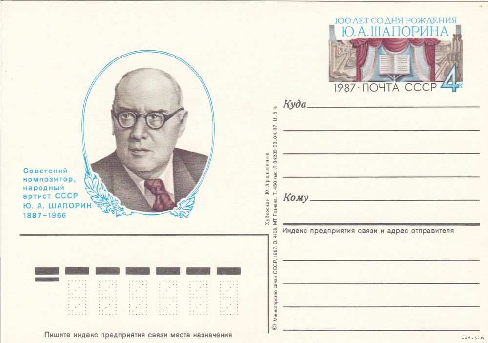 СССР 1987 ПК с ОМ 100-летие со дня рождения композитора Ю. А. Шапорина (к3)