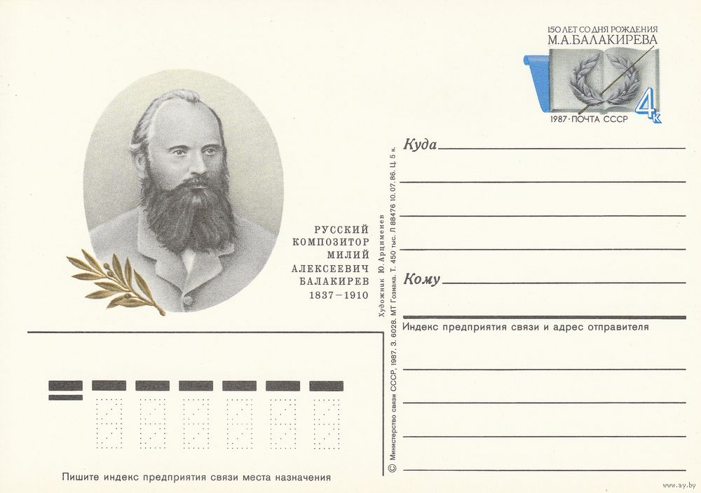 СССР 1987 ПК с ОМ 150-летие со дня рождения композитора М. А. Балакирева (к3)