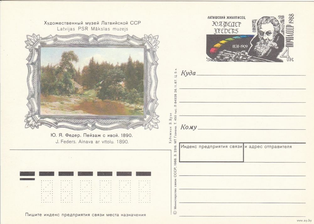 СССР 1988 ПК с ОМ 150-летие со дня рождения художника Ю. Я. Федера (Федерса) (к3)