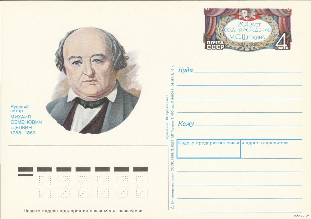 СССР 1988 ПК с ОМ 200-летие со дня рождения актёра М. С. Щепкина (к3)