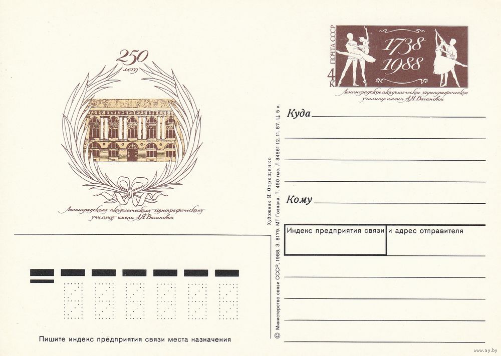 СССР 1988 ПК с ОМ 250-летие Ленинградского академического хореографического училища им. А. Я. Вагановой (к3)