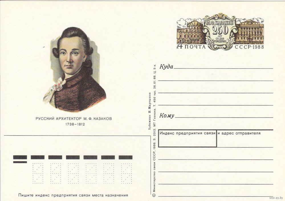 СССР 1988 ПК с ОМ 250-летие со дня рождения архитектора М. Ф. Казакова (к3)