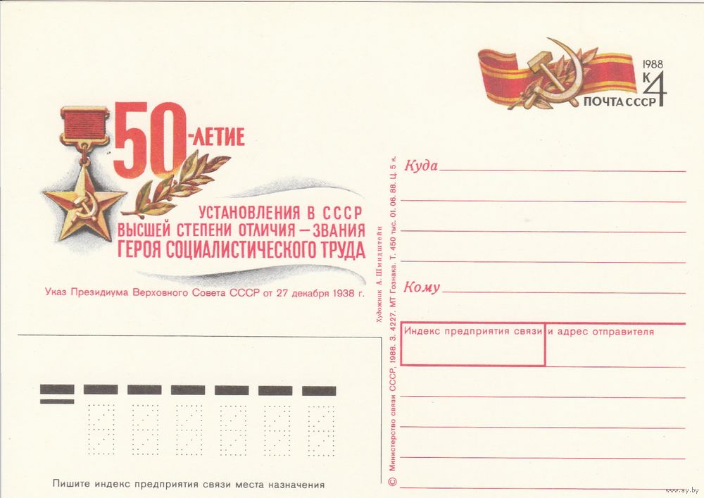 СССР 1988 ПК с ОМ 50-летие установления в СССР звания Герой социалистического труда (к3)