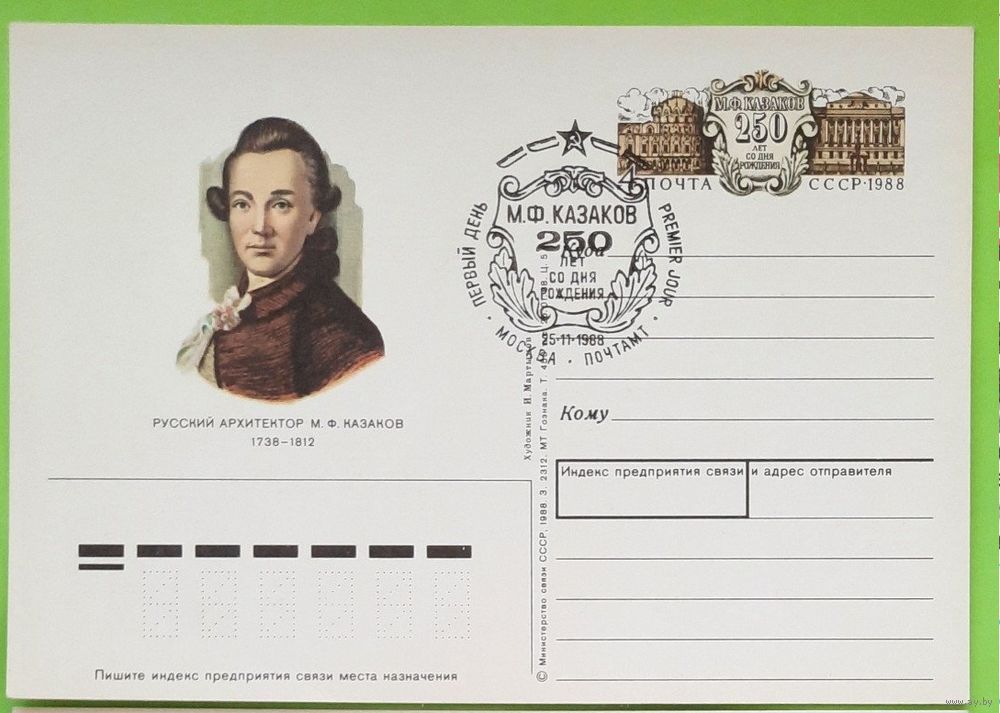 СССР 1988 ПК с ОМ ПП Русский архитектор Казаков 250 лет СГ Москва ПД