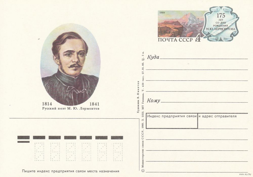 СССР 1989 ПК с ОМ 175-летие со дня рождения М. Ю. Лермонтова (к3)