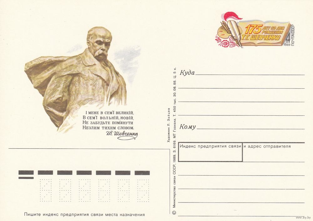 СССР 1989 ПК с ОМ 175-летие со дня рождения Т. Г. Шевченко (к3)